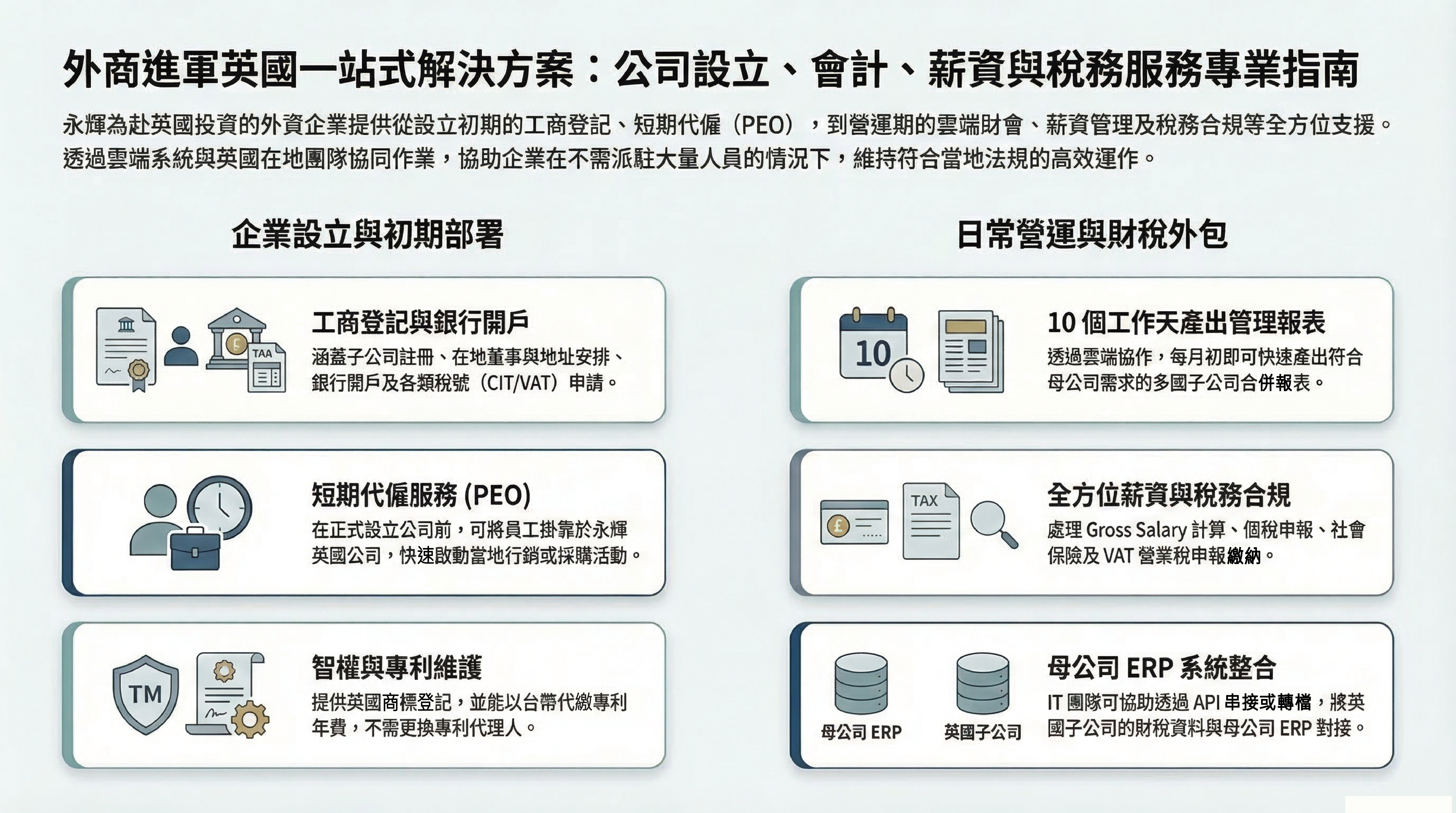 除了提供外資公司登記外,在雲會計和薪資系統的支持下,永輝擔任貴司在英國子公司內部會計角色,承擔了會計,薪資, 稅務,法規遵循等一站式服務。英國同事攜手協同爲您服務,減少空中旅行,為地球暖化盡一份心力。